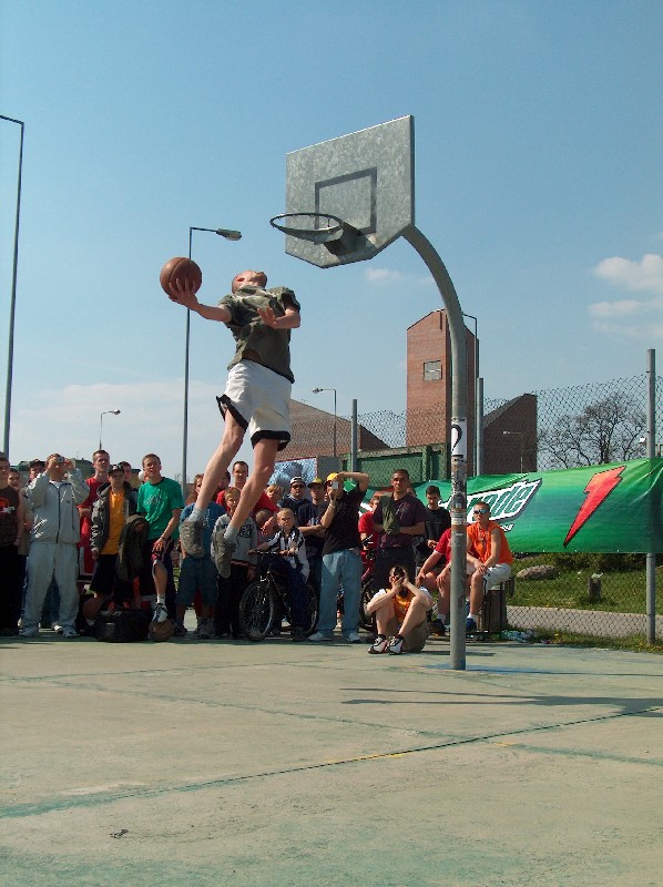 Następnie przyszła kolej na najwiekszą atrakcję tej imprezy, czyli konkurs wsadów. Był on sędziowany między innymi przez Człowieka Nowej Ery. Wystąpiło w nim siedmiu dunkerów. W pierwszej rundzie można było podziwiać kilka całkiem niezłych wsadów. Jednym z lepszych, jak nie najlepszym, było bardzo mocne 360 Tomasza Breczko. Aplauz publiki wzbudził też power dunk Oskara i wsad Slasha ponad banerem. Kilka prób nie wyszło z kolei Baginowi i Bule. W drugiej rundzie (do której przeszło czterech zawodników) najlepiej zaprezentował się Oskar, który po wyrzuceniu sobie piłki złapał ją daleko od kosza i z dużą siłą wykonał wsad. Slash wykonał dunka, w którym przeskoczył nad Bartem, a Tomasz wykonał kolejnego power dunka. Końcowa kolejność – Oskar, Slash, Tomasz Breczko. Na boiskach pojawili się breakdancerzy z Breakoholix, powoli rozgrzewając się przed swoim występem. Przyszła pora na ćwiercfinały. Poziom był naprawdę wysoki, ale po raz kolejny wyróżniła się ekipa Oskarków, a oprócz nich do półfinałów awansowały ekipy PL Mixtape 2k5, Piaseczna i Białych Okien PCV. Po tych czterech spotkaniach koncert zagrała ekipa Wwarstwa, czyli dwójka Pekacz i Łysol, reprezentanci Ochoty. Na początek pomagał im Kaczmar. Na jego podkładzie, czyli human beat boxie, zarapowali swój pierwszy utwór. Oprócz tego zaprezentowali jeszcze trzy kawałki. Ze wszystkich trzech koncertów ten chyba najbardziej przypadł do gustu publice. Zresztą nie był to dla Wwarstwy pierwszy taki występ. Mają ich już wiele na koncie, a ten na pewno mogą zaliczyć do bardzo udanych. Potem swoje 15 minut mieli b-boy’e, którym DJ Emka specjalnie zapuścił kilka funkowych kawałków, muzyka prosto z lat siedemdziesiątych. Warto zaznaczyć, że można ich było podziwiać o wiele dłużej, przez blisko półtorej godziny dawali próbkę swoich niemałych umiejętności. W międzyczasie na piątym koszu rozpoczęły się rozgrywki turnieju kobiet. Wzięło w nich udział sześć ekip. Jedną z niespodzianek był fakt, źe tym razem zwycięstwa nie odniosły dziewczyny z ekipy Bzyków, które musiały się zadowolić drugim miejscem. Najlepsze okazały się Tańczące Bączki.