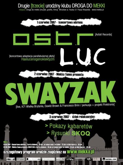 Wrocławski klub Droga do Mekki obchodzi swoje urodziny z tej okazji mamy dla Was dwa pojedyńcze zaproszenia na impreze na której zagrają O.S.T.R oraz LuC ( Kanał Audytywny).