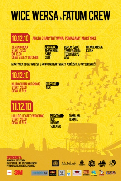 Wszystkich, którym nie jest obojętne ludzkie nieszczęście zapraszamy na mini tour – dwóch wrocławskich zespołów tworzących hip-hop. Fatum Crew i Wice Wersa bo o nich mowa, zagrają 3 charytatywne koncerty pod hasłem „Pomagamy wyzdrowieć Martynce†. Dziewczynka na rzecz której odbędą się koncerty walczy od lat z nowotworem twarzy….Wszystkich tych, którzy nie są obojętni na ciężki los ludzi chorych zapraszamy na 3 wspólne koncerty obu zespołów.
