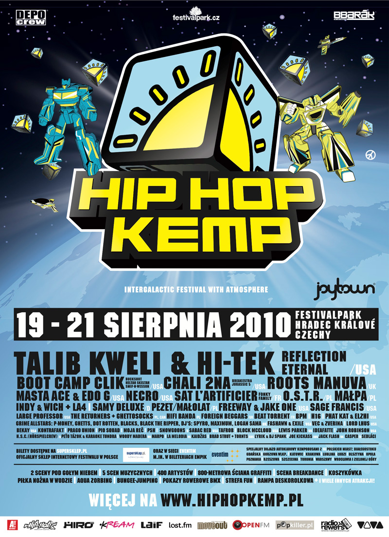 Dziewiąta edycja Hip Hop Kemp zbierze kilkanaście tysięcy miłośników kultury czterech elementów 19-21 sierpnia 2010 r. po raz kolejny na malowniczym terenie FestivalParku, czyli dawnego lotniska w czeskim Hradec Králové (raptem 40 km od polskiej granicy w Kudowie Zdrój). Tegoroczny line-up wbija w fotel wszystkich fanów solidnego rapowego brzmienia. Hałas na Kempie zrobią bowiem takie amerykańskie legendy, jak Q-Tip z A Tribe Called Quest, Chali 2na z Jurassic 5 (razem z The Breakestra), Masta Ace i Edo G, Freeway (Def Jam Records), Large Professor z Main Source oraz nowojorski kolektyw Boot Camp Clik (Buckshot z Blackmoon, Heltah Skeltah, Smif N Wessun…). Mało? Różne oblicza niezależnego rapu pokażą też Sage Francis (Anticon), Necro, Sabac Red z Non Phixion czy Fashawn. „Can I kick it?†„Yes you can!!!â€
