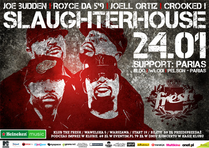 24.stycznia w Imprezowym Centrum Miasta pierwszy i jedyny w Polsce koncert zagrają Royce da 5’9″, Joe Budden, Crooked I i Joell Ortiz czyli Slaughterhouse! Support przed ich koncertem również będzie nie lada wydarzeniem na polskiej scenie – na pierwszym premierowym koncercie wystpią Eldo, Włodi i Pelson jako Parias.