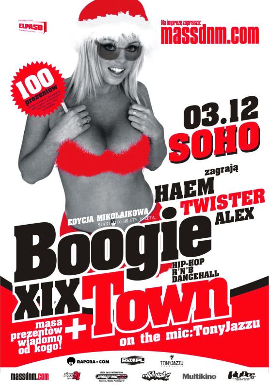 Podczas imprezy rozdanych zostanie 100 prezentów mikołajkowych (w tym: czapki Mass’a, odzież, płyty i bilety do Multikina). Od godz. 22.00 Boogie Town będzie transmitowane przez www.rapgra.com.