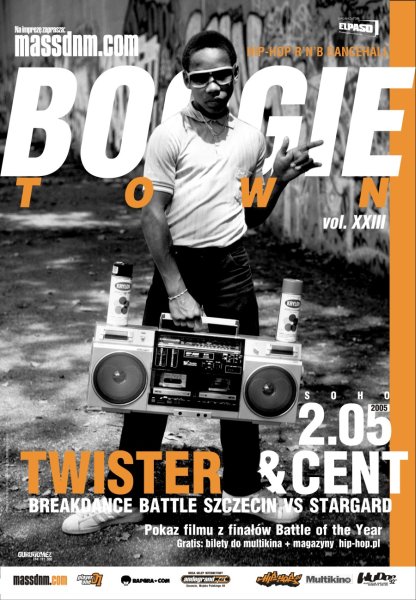 Boogie Town to impreza znana z doskonałych obsad dj’skich. 8 kwietnia w szczecińskim Soho zagości Dj Cent. Style które mixuje i preferuje to: hip- hop, rnb, ragga dancehall, soul, funk. Grał z Cut Killer,The Beatnuts, Cocoa Brovaz, Boss NTM, Mc Blade&Dj First Rate, a także w Harlemie w NY. Ma na swoim koncie mixtape” FILIP BEATZ 1″.