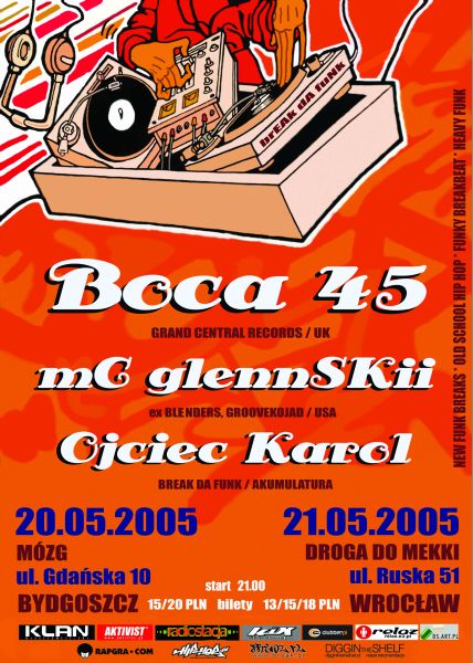 Kolejna mini-trasa brEAk dA fUnk odbędzie się w dniach 19-21 maja w Warszawie (Paprotka), Bydgoszczy(Mózg) i Wrocławiu (Droga do Mekki). Tym razem jako gość specjalny wystąpi BOCA 45 oraz mC glennSKii i Ojciec Karola.