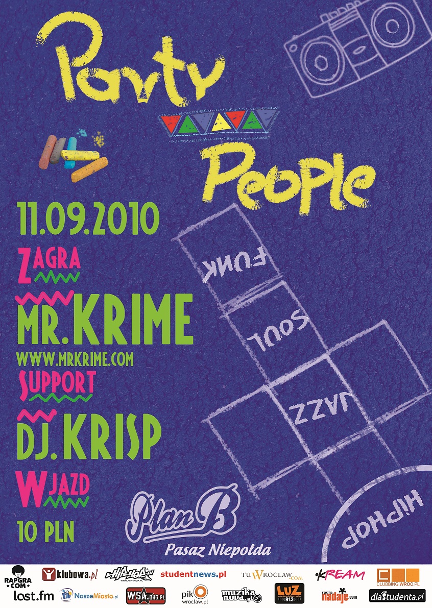 Muzyk, artysta, wirtuoz, wielka osobowość klubowej sceny… lub po prostu Mr. Krime, już wkrótce, bo 11 września 2010 będzie gościł w towarzystwie DJ Krispa wszystkich spragnionych wrażeń imprezowiczów we wrocławskim klubie Plan B, podczas imprezy z cyklu Party People.