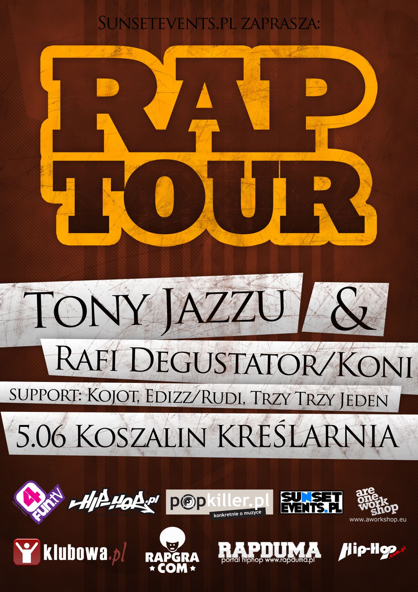 Agencja SunsetEvents serdecznie zaprasza na pierwszy koncert z cyklu RAP TOUR, który odbędzie się w klubie Kreślarnia w Koszalinie 05.06.2011.