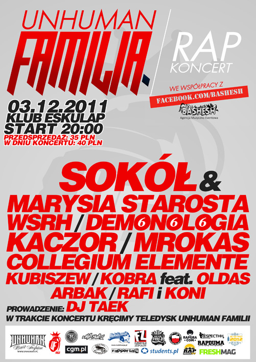 Trasa Unhuman Familii rozpocznie się 14.10.11 w Wągrowcu. Zagrają tam Kubiszew i Collegium Elemente. 15.10.11 odbędzie się oficjalny trasowy warm up. Imprezę w  poznańskim klubie u Bazyla rozkręci DJ Taek. Zwieńczeniem trasy będzie  grudniowy koncert w Eskulapie (Poznań). Poza  załogą z wielkopolskiego podwórka wystąpią  Sokół & Marysia Starosta. Koncert odbędzie się 3.12.11 . Więcej informacji wkrótce.