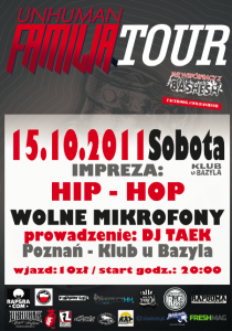 Trasa Unhuman Familii rozpocznie się 14.10.11 w Wągrowcu! Natomiast 15.10.11 odbędzie się oficjalny trasowy warm up. Zwieńczeniem trasy będzie grudniowy event w Eskulapie (Poznań).