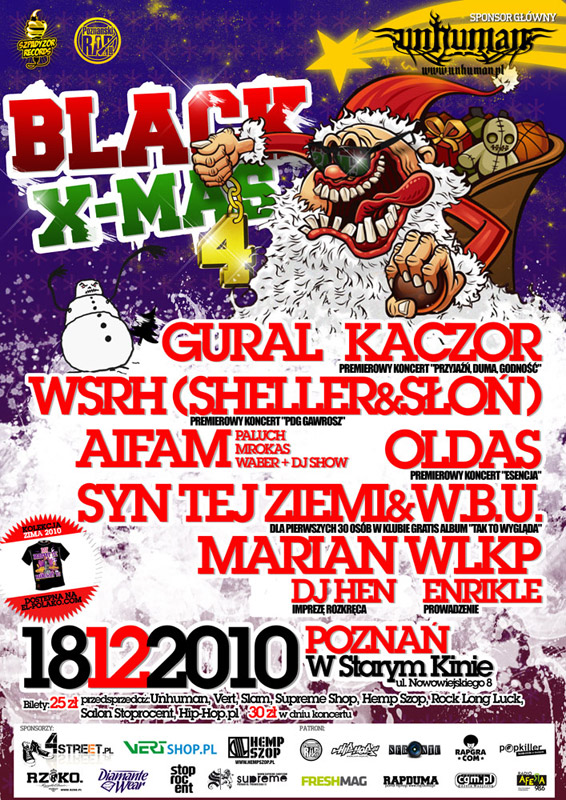 Black X-Mas 4, które odbędzie się w tym roku zapowiada się równie wyśmienicie jak poprzednie edycję. Na scenie w Poznaniu (18.12, W Starym Kinie) zobaczymy i usłyszymy: donGURALesko ze znakomitym albumem „Totem Leśnych Ludzi„, najbardziej oczekiwane będą premierowe koncerty: Kaczora, który zaprezentuje nam materiał „Przyjaźń, Duma, Godność” (premiera Grudzień 2010, Szpadyzor Records) oraz Shellera, który wystąpi z długo oczekiwanym, pierwszym solowym albumem „PDG Gawrosz„! Kolejni artyści to Słoń, który wydał w tym roku wraz z Mikserem krążek „Demonologia„. Nie zabraknie oczywiście wspólnych kawałków Shelleriniego i Słonia spod szyldu WSRH! Oldas zaprezentuje nam po raz pierwszy materiał z albumu „Esencja„, którego premiera odbędzie się na początku przyszłego roku. Aifam czyli Mrokas, Paluch, Waber zagrają dla Was materiał z płyty „Ponad Tym” oraz z solowego albumu Palucha „Bezgranicznie Oddany„. Listę wykonawców zamykają SynTejZiemi&W.B.U. z płytą „Tak To Wygląda„.