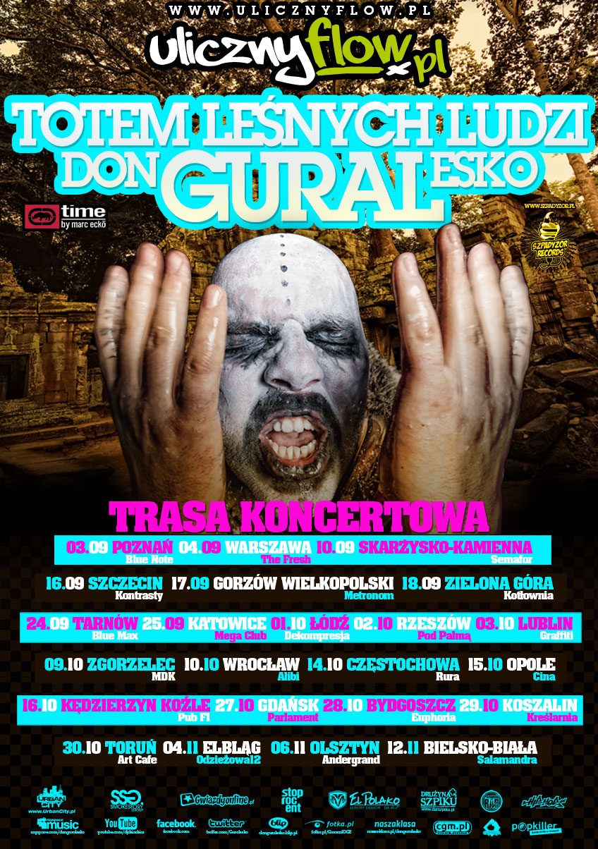 Szpadyzor Records i Ulicznyflow.pl zaprasza na największą trasę w historii polskiego Hip-Hopu! W ramach promocji najnowszego albumu „Totem leśnych Ludzi” donGURALesko, wraz z całą załogą poznańskiej wytwórni odwiedzi ponad 20 miast w Polsce, które na długo zapamiętają imprezy z poznańskim raperem w roli głównej!