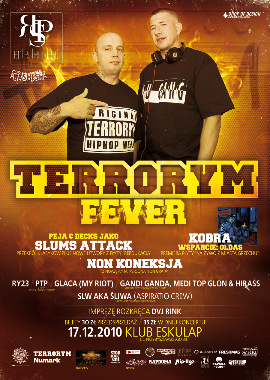 TERRORYM FEVER to impreza zrzeszająca sympatyków SLU Gangu i ludzi trzymających z nami sztamę zarówno w muzyce jak i życiu codziennym. Podczas koncertu oprócz Slums Attack zaprezentuje się zarówno scena lokalna (Kobra, Oldas, RY 23, Gandi Ganda, Medi Top i SLW) jak i goście z innych części kraju (białostocka NON Koneksja, toruński skład PTP). Jako gość specjalny wystąpi Glaca (ex Sweet Noise), który oprócz kawałków z Rychem zaprezentuje nowy utwór z projektu My Riot.