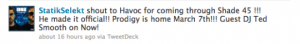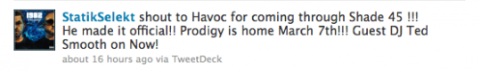 7 marca Prodigy wychodzi na wolność. P aktualnie odsiaduje wyrok 3 lat pozbawienia wolności za nielegalne posiadanie broni. Poniżej możecie zobaczyć wpis z Twittera Statik Selekta, który prowadził wyżej wymienioną audycję.